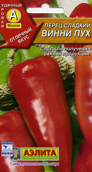 Следующий экземпляр коллекции — полузнакомый мне сладкий перец "Винни-Пух". Информация с пакета: "Раннеспелый сорт: от всходов до технической спелости 100-110 дней. Растение низкорослое, малооблиственное, высота 25-30 см. Плоды конусовидной формы, массой 45-60 г, с сочной нежной мякотью отличных вкусовых качеств. Формирование плодов дружное. Сорт характеризуется повышенной лежкостью и транспортабельностью. Для защищенного и открытого грунта".